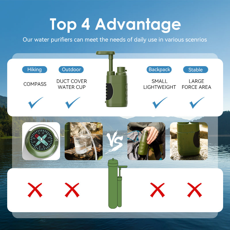 Picture yourself confidently using the ergonomic design of the Purewell Water Purifier Pump, which includes a special rubber grip for a sturdy surface while filtering. Its food-grade materials guarantee safety, and the upgraded handle allows for easy operation without the worry of breakage. The transparent lid doubles as a drinking cup, and the integrated compass enhances your outdoor experience – it’s these thoughtful details that truly set this product apart.